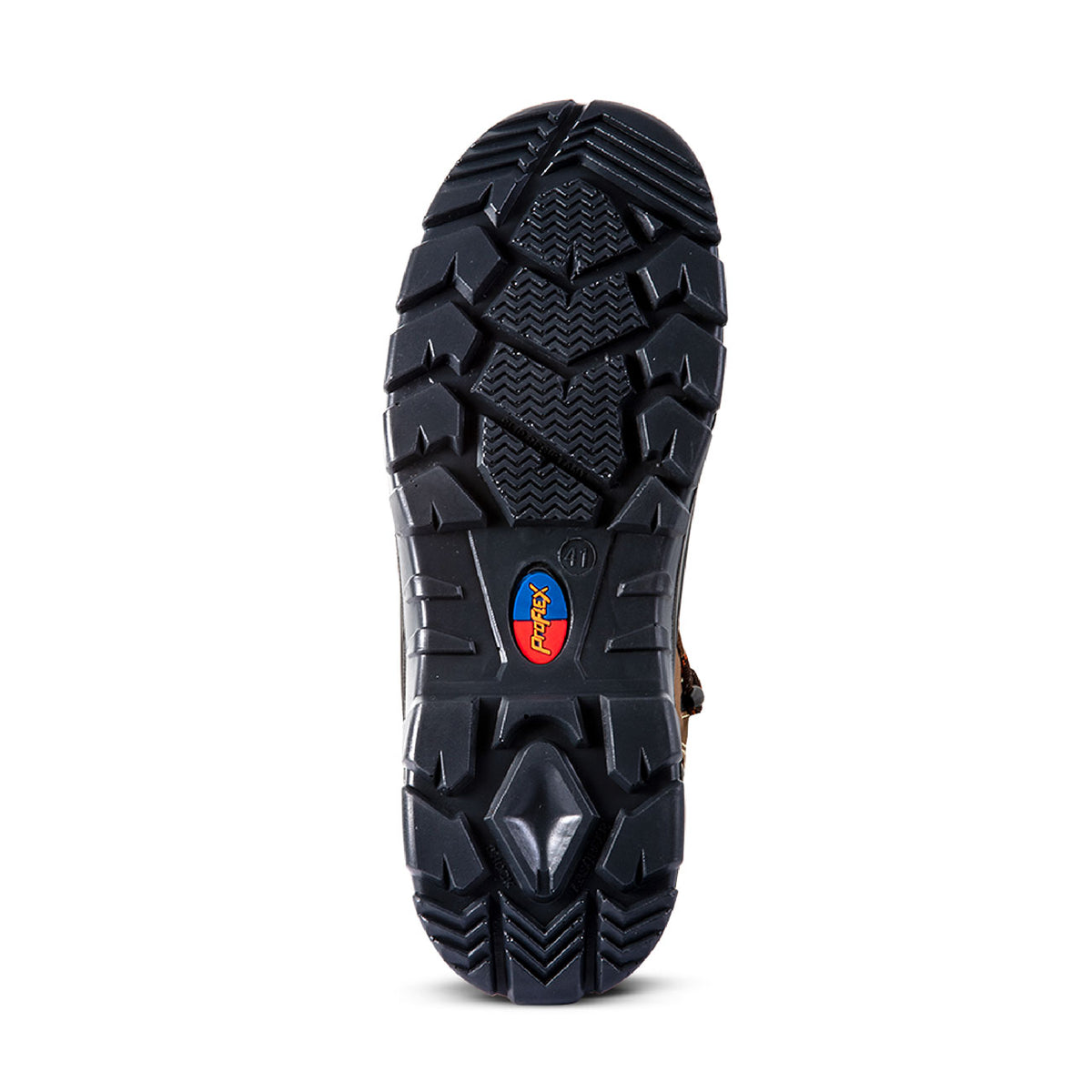La planta bidensidad (PU/PU) es resistente a hidrocarburos, aislante eléctrico, y está equipada con sistema anti torsión y propiedades antideslizantes (Antislip – EN ISO 13287), ideales para superficies irregulares o resbaladizas. La construcción por inyección directa al cuero asegura mayor durabilidad y sellado estructural.