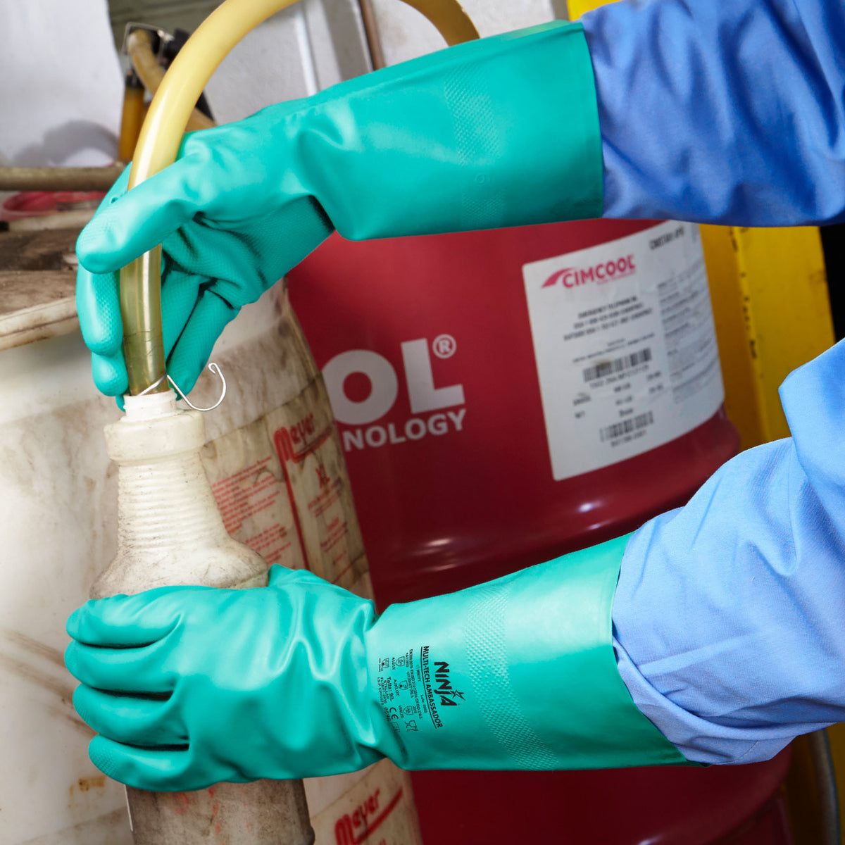Los Guantes de seguridad Ninja Ambassador están fabricados en nitrilo flocado verde de alta resistencia, diseñados para ofrecer una protección superior contra químicos agresivos, solventes, combustibles y grasa.
