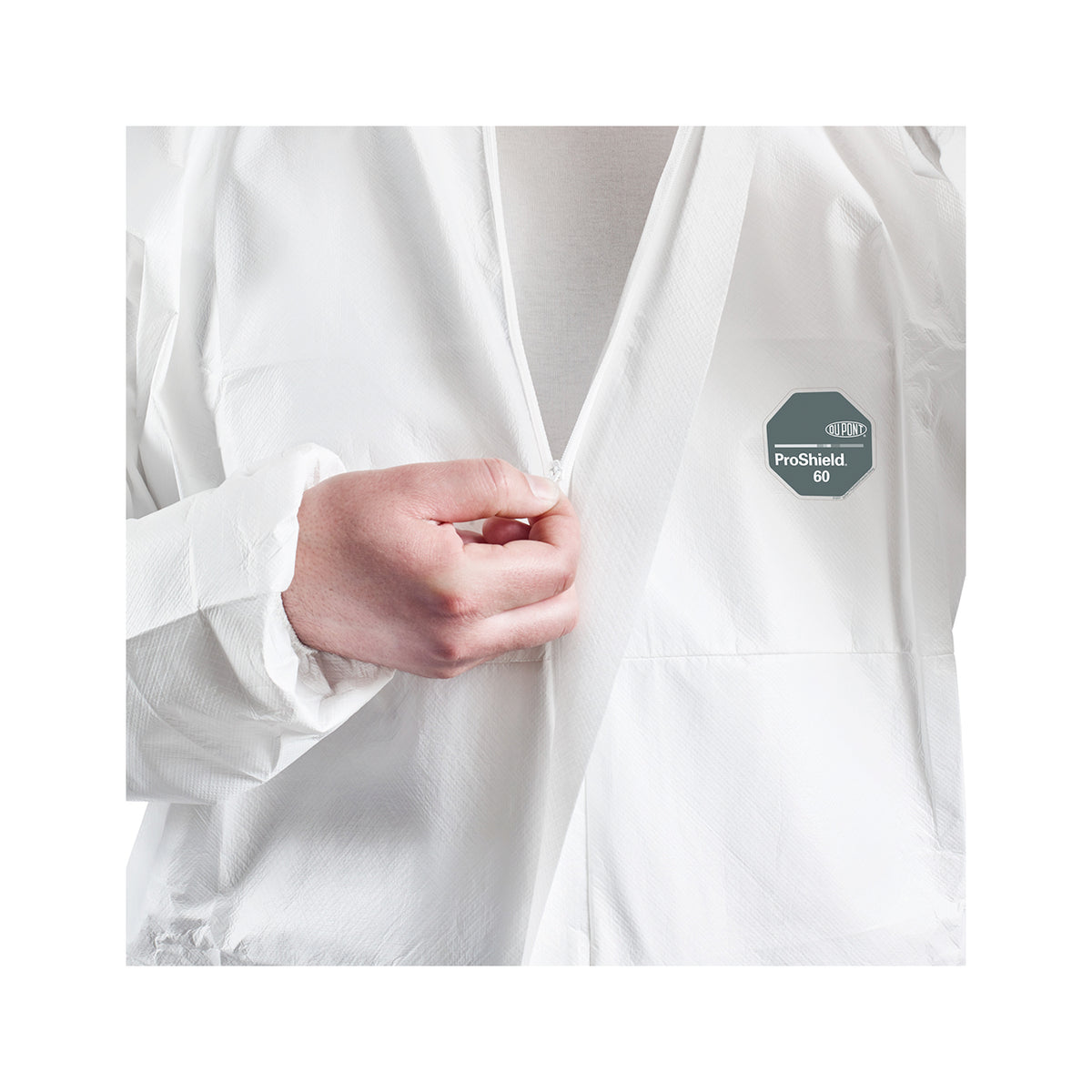 Manténgase seguro y protegido con el mono químico Dupont Proshield 60. Perfecto para cualquier trabajo que involucre materiales particulados, salpicaduras ocasionales (no tóxicos), pintura, lubricantes y limpieza en general. La construcción de polipropileno laminado, la capucha y los puños y tobillos elásticos brindan protección total. ¡Manténgase seguro y haga el trabajo!