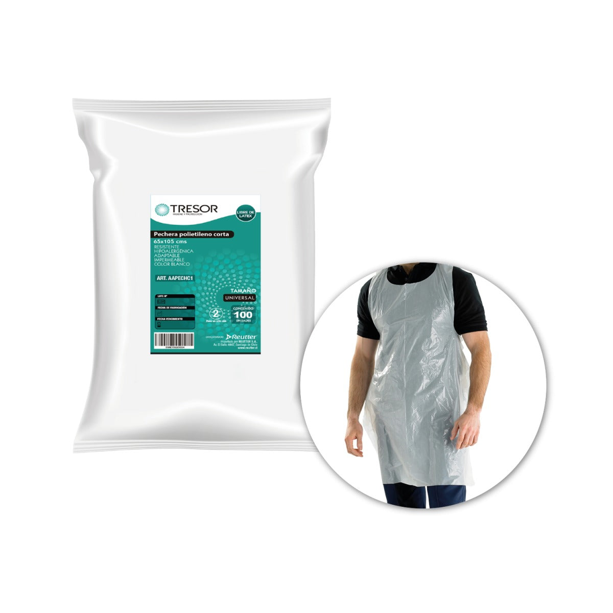 Proteja su cuerpo con la Pechera Tresor Polietileno Desechable. Impermeable y resistente a riesgos físicos y químicos, esta pechera corta brinda máxima protección en ambientes clínicos e industriales. ¡No se preocupe más por su seguridad, confíe en la calidad de Reutter!