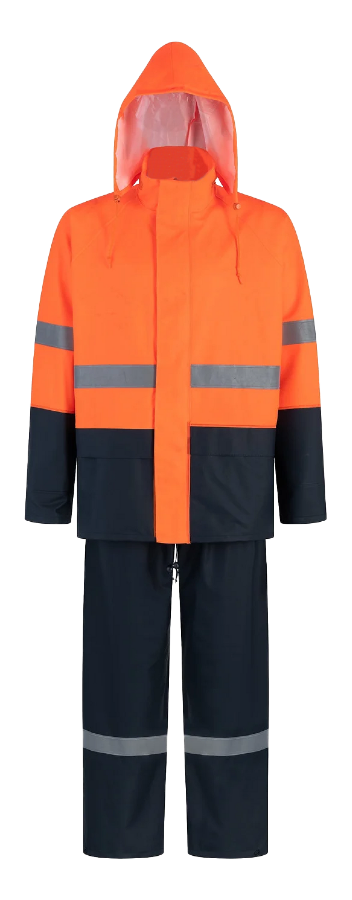 Conjunto de chaqueta con gorro ajustable incorporado y visera de PVC transparente y pantalón de PU-PVC cómodo y flexible.
