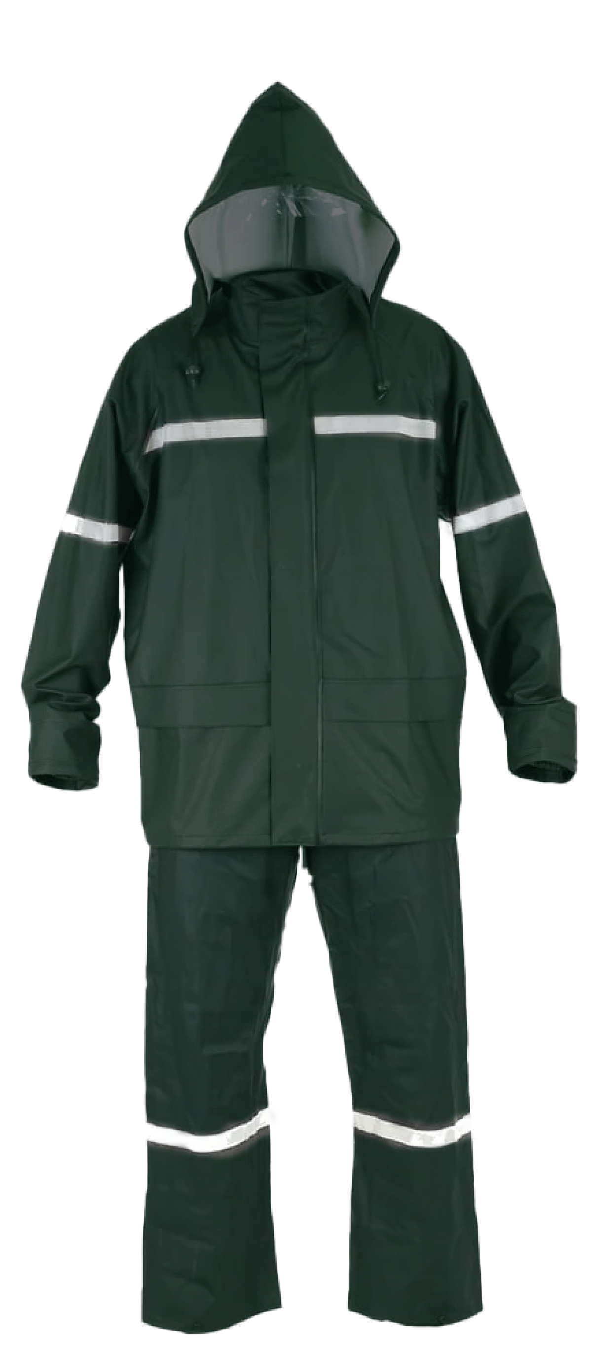 El traje posee uniones termo selladas con ventilación bajo el brazo y en la espalda, cuenta con cordón de ajuste en gorro y chaqueta, con cierre de plástico y velcro, bolsillos anti derrame.
